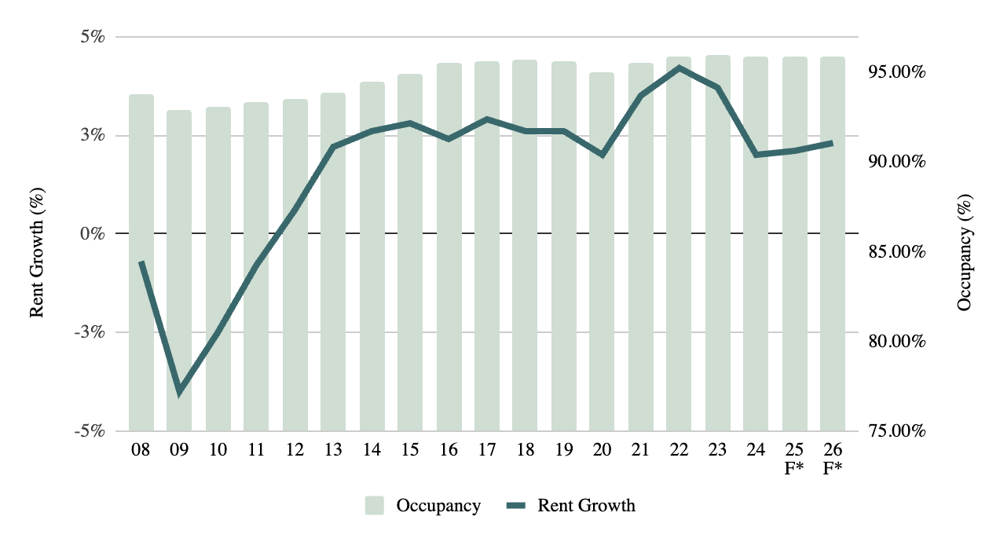 Figure 1: Retail occupancy (bar) and rent growth (line) by year, with forecasts. Occupancy remains very high (~92–93%) and rent growth has stabilized around 2–3%.
