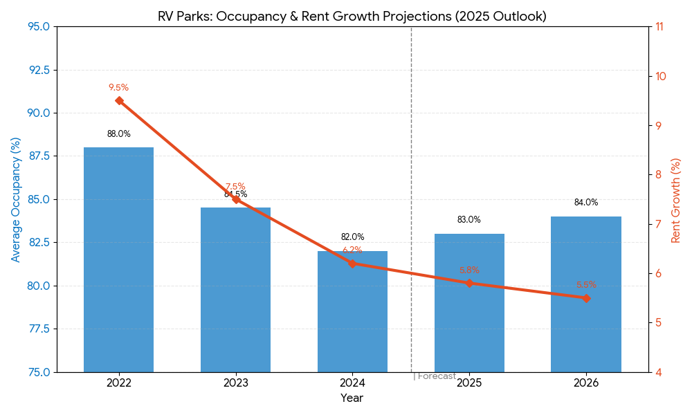 Figure 1: RV Park Occupancy (bar) and Rent Growth (line) by year, with forecasts. High-quality RV parks maintain strong average occupancy, projected to remain near 80–85% (including seasonal variability). Rent growth is expected to stabilize at a healthy 5–7% for premium assets.